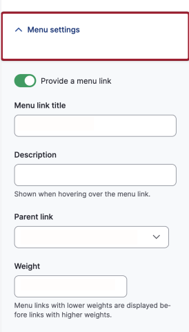 When editing a page, navigate to 'Menu Settings' in in the 'Advanced settings' tab near the bottom, or within the right-hand sidebar, click 'Provide a Menu Link'. This brings up a few options: