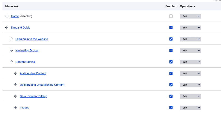 To adjust the positioning of the menu links, click on the crosshair icon next to the menu link title. This will allow you to drag and re-order the menu items. To edit the wording of a menu link, select ‘Edit’ under the Operations heading. Make the change in the Menu link title box and save by clicking the button at the bottom of the edit page. Save the new configuration by clicking the ‘Save Configuration’ button at the bottom of the Menu Link page and test when complete.